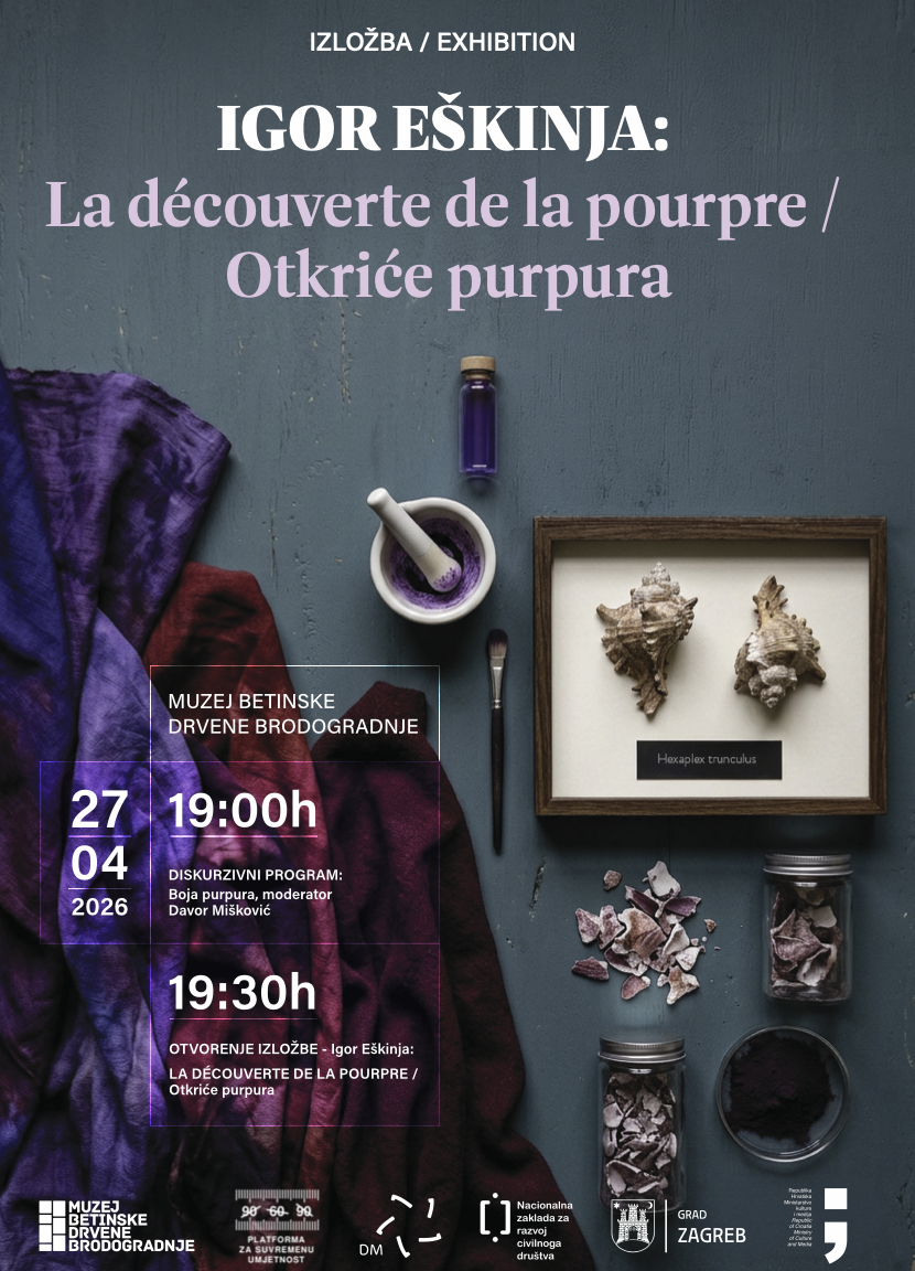 Izložba Igora Eškinje, “La decouverte de la pourpre / Otkriće purpura” u organizaciji Galerije 90-60-90 ostvarena je u suradnji s Muzejom betinske drvene brodogradnje te udrugom Drugo more, a u sklopu otvorenja će se se održati diskurzivni program kojeg će moderirati Davor Mišković, pod nazivom “Boja purpura”.